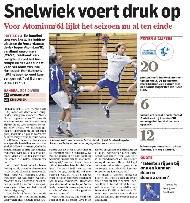 De hanballers van Snelwiek Rotterdam hebben met 27 doelpunten verdiend gewonnen tegen Atomium met 23 doelpunten.