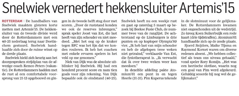 Rotterdam | De handballers van Snelwiek maakten gisteren korte metten met Artemis '15. De hekkensluiter van de tweede divisie werd door de...