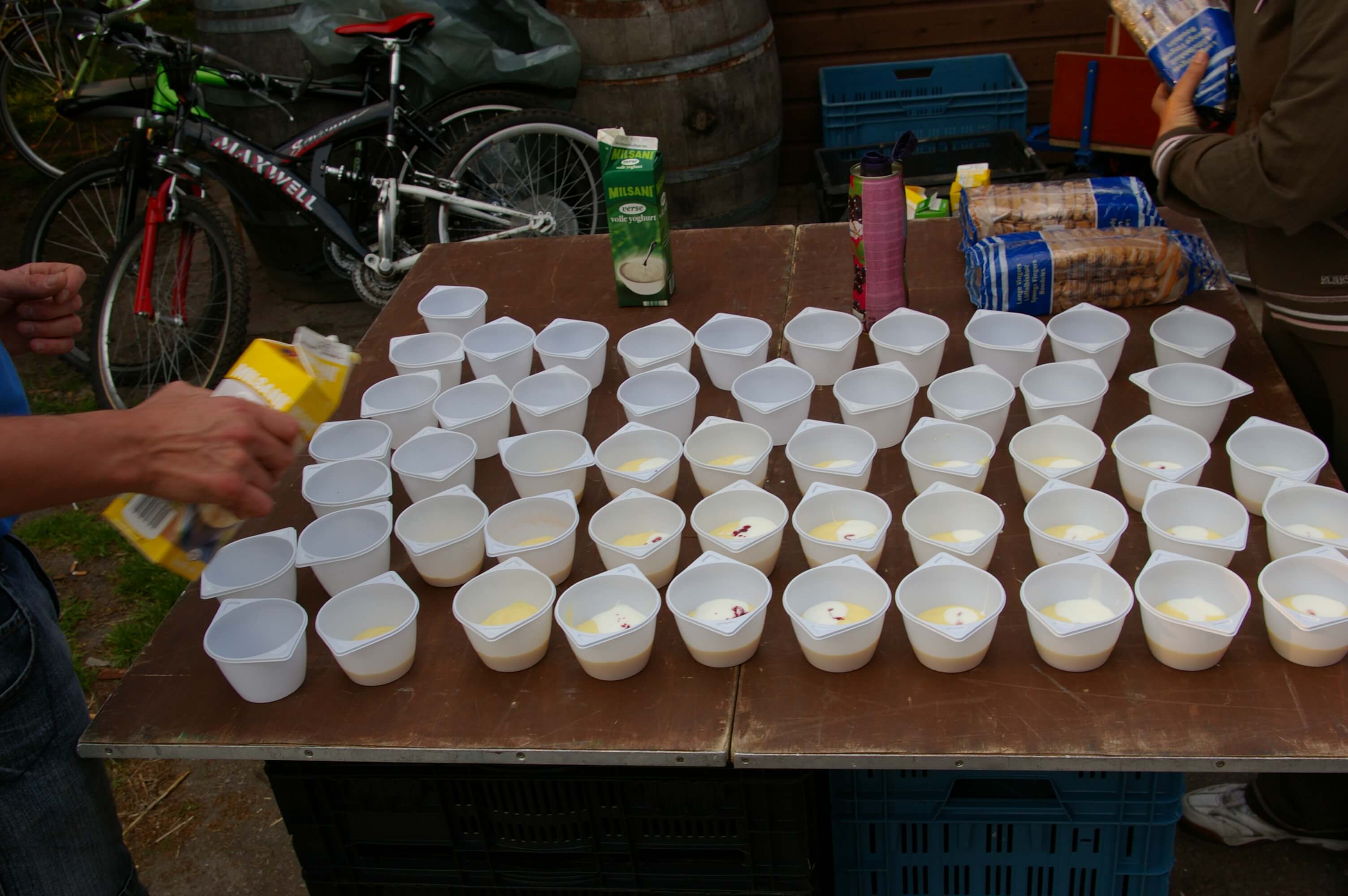 Gelukkig is er ook altijd wel ruimte over voor een toetje: vla en yoghurt met siroop of hagelslag!